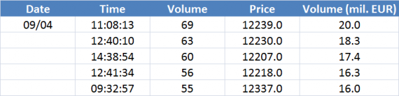 Největší obchody podle objemu na DAX (aktivní future kontrakt)