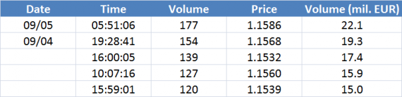 Největší obchody podle objemu na EURUSD (aktivní future kontrakt):