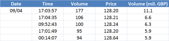 Největší obchody podle objemu na GBPUSD (aktivní future kontrakt):