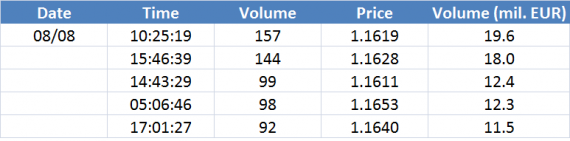 Největší obchody podle objemu na EURUSD (aktivní future kontrakt):