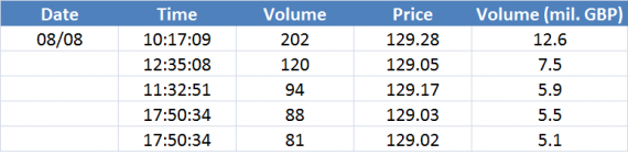 Největší obchody podle objemu na GBPUSD (aktivní future kontrakt):