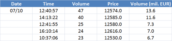 Největší obchody podle objemu na DAX (aktivní future kontrakt)
