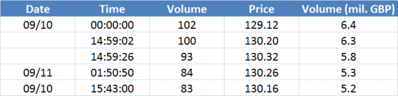 Největší obchody podle objemu na GBPUSD (aktivní future kontrakt):