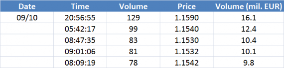 Největší obchody podle objemu na EURUSD (aktivní future kontrakt):