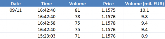 Největší obchody podle objemu na EURUSD (aktivní future kontrakt):