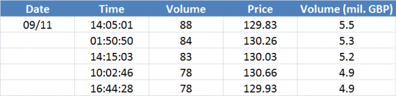 Největší obchody podle objemu na GBPUSD (aktivní future kontrakt):