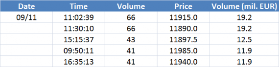 Největší obchody podle objemu na DAX (aktivní future kontrakt)