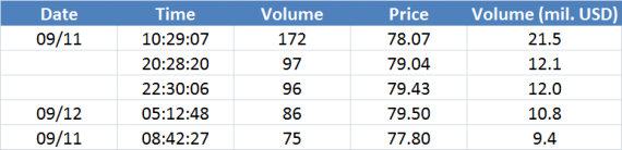 Největší obchody podle objemu na Brent (aktivní future kontrakt)