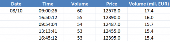 Největší obchody podle objemu na DAX (aktivní future kontrakt)