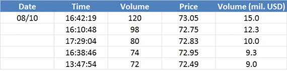 Největší obchody podle objemu na Brent (aktivní future kontrakt)