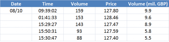 Největší obchody podle objemu na GBPUSD (aktivní future kontrakt):
