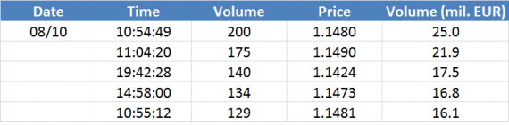 Největší obchody podle objemu na EURUSD (aktivní future kontrakt):
