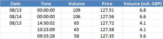Největší obchody podle objemu na GBPUSD (aktivní future kontrakt):