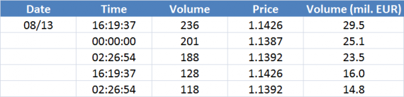 Největší obchody podle objemu na EURUSD (aktivní future kontrakt):