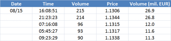 Největší obchody podle objemu na EURUSD (aktivní future kontrakt):