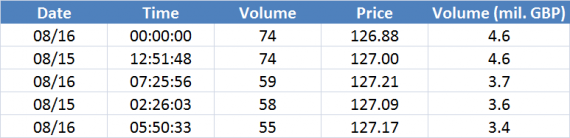 Největší obchody podle objemu na GBPUSD (aktivní future kontrakt):