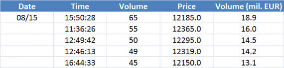 Největší obchody podle objemu na DAX (aktivní future kontrakt)