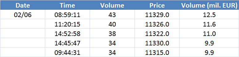 Největší obchody podle objemu na DAX (aktivní future kontrakt)