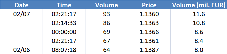 Největší obchody podle objemu na EURUSD (aktivní future kontrakt):