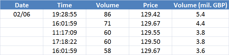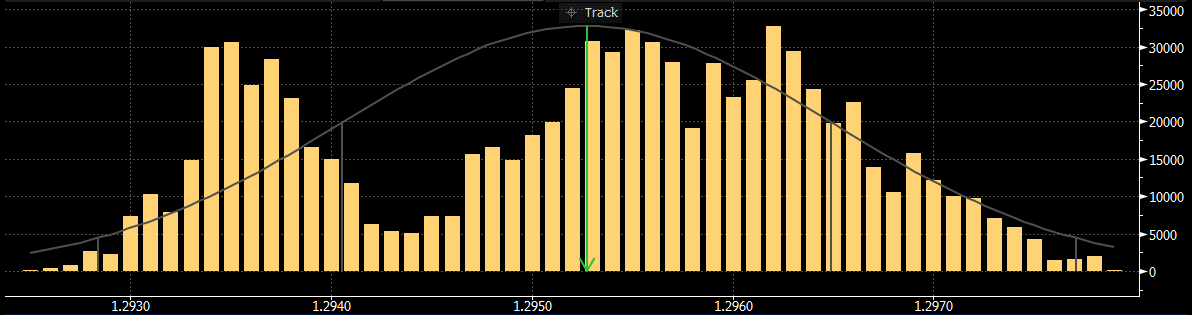 Největší obchody podle objemu na GBPUSD (aktivní future kontrakt): Největší denní objemy na trhu s měnovými futures. Na cenách, kde se včera objevily největší objemy, mohou být velcí hráči aktivní i dnes – zejména pokud se tyto ceny pohybují u některého ze včerejších high/low.