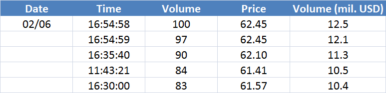 Největší obchody podle objemu na Brent (aktivní future kontrakt)