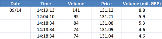 Největší obchody podle objemu na GBPUSD (aktivní future kontrakt):
