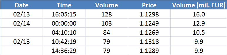 Největší obchody podle objemu na EURUSD (aktivní future kontrakt):
