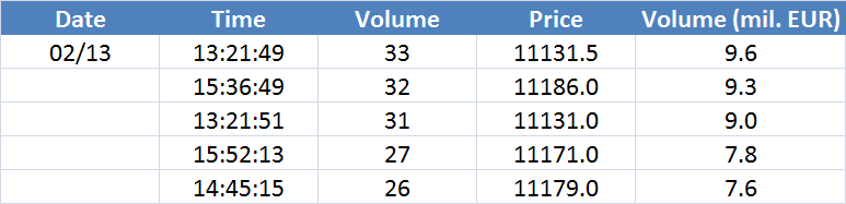 Největší obchody podle objemu na DAX (aktivní future kontrakt)