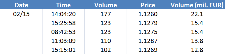 Největší obchody podle objemu na EURUSD (aktivní future kontrakt):