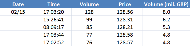 Největší obchody podle objemu na GBPUSD (aktivní future kontrakt): Největší denní objemy na trhu s měnovými futures. Na cenách, kde se včera objevily největší objemy, mohou být velcí hráči aktivní i dnes – zejména pokud se tyto ceny pohybují u některého ze včerejších high/low.