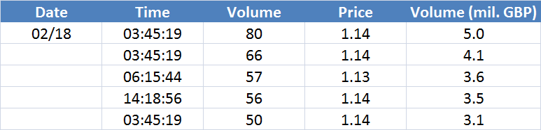Největší obchody podle objemu na GBPUSD (aktivní future kontrakt): Největší denní objemy na trhu s měnovými futures. Na cenách, kde se včera objevily největší objemy, mohou být velcí hráči aktivní i dnes – zejména pokud se tyto ceny pohybují u některého ze včerejších high/low.