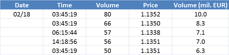 Největší obchody podle objemu na EURUSD (aktivní future kontrakt):