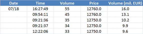 Největší obchody podle objemu na DAX (aktivní future kontrakt)