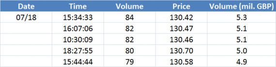 Největší obchody podle objemu na GBPUSD (aktivní future kontrakt):
