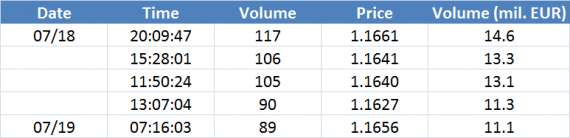 Největší obchody podle objemu na EURUSD (aktivní future kontrakt):