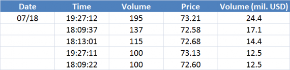 Největší obchody podle objemu na Brent (aktivní future kontrakt)