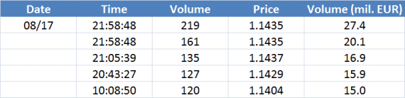 Největší obchody podle objemu na EURUSD (aktivní future kontrakt):