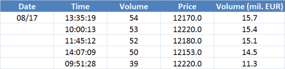 Největší obchody podle objemu na DAX (aktivní future kontrakt)