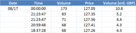Největší obchody podle objemu na GBPUSD (aktivní future kontrakt):