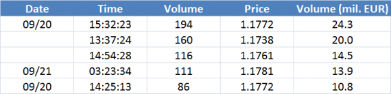 Největší obchody podle objemu na EURUSD (aktivní future kontrakt):