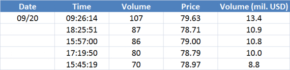 Největší obchody podle objemu na Brent (aktivní future kontrakt)
