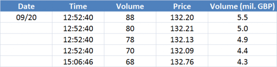 Největší obchody podle objemu na GBPUSD (aktivní future kontrakt):