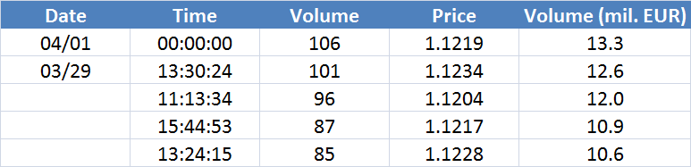 Největší obchody podle objemu na EURUSD (aktivní future kontrakt):