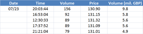 Největší obchody podle objemu na GBPUSD (aktivní future kontrakt):