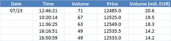 Největší obchody podle objemu na DAX (aktivní future kontrakt)