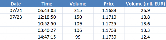 Největší obchody podle objemu na EURUSD (aktivní future kontrakt):
