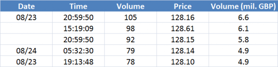 Největší obchody podle objemu na GBPUSD (aktivní future kontrakt):