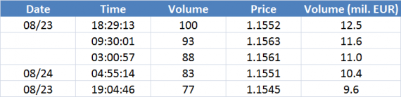 Největší obchody podle objemu na EURUSD (aktivní future kontrakt):