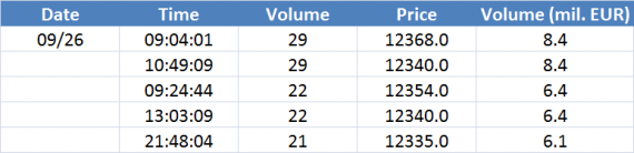 Největší obchody podle objemu na DAX (aktivní future kontrakt)