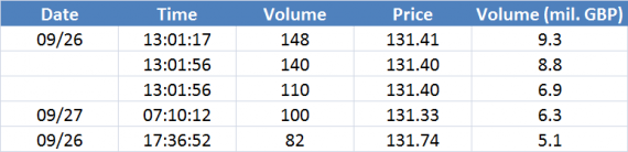 Největší obchody podle objemu na GBPUSD (aktivní future kontrakt):